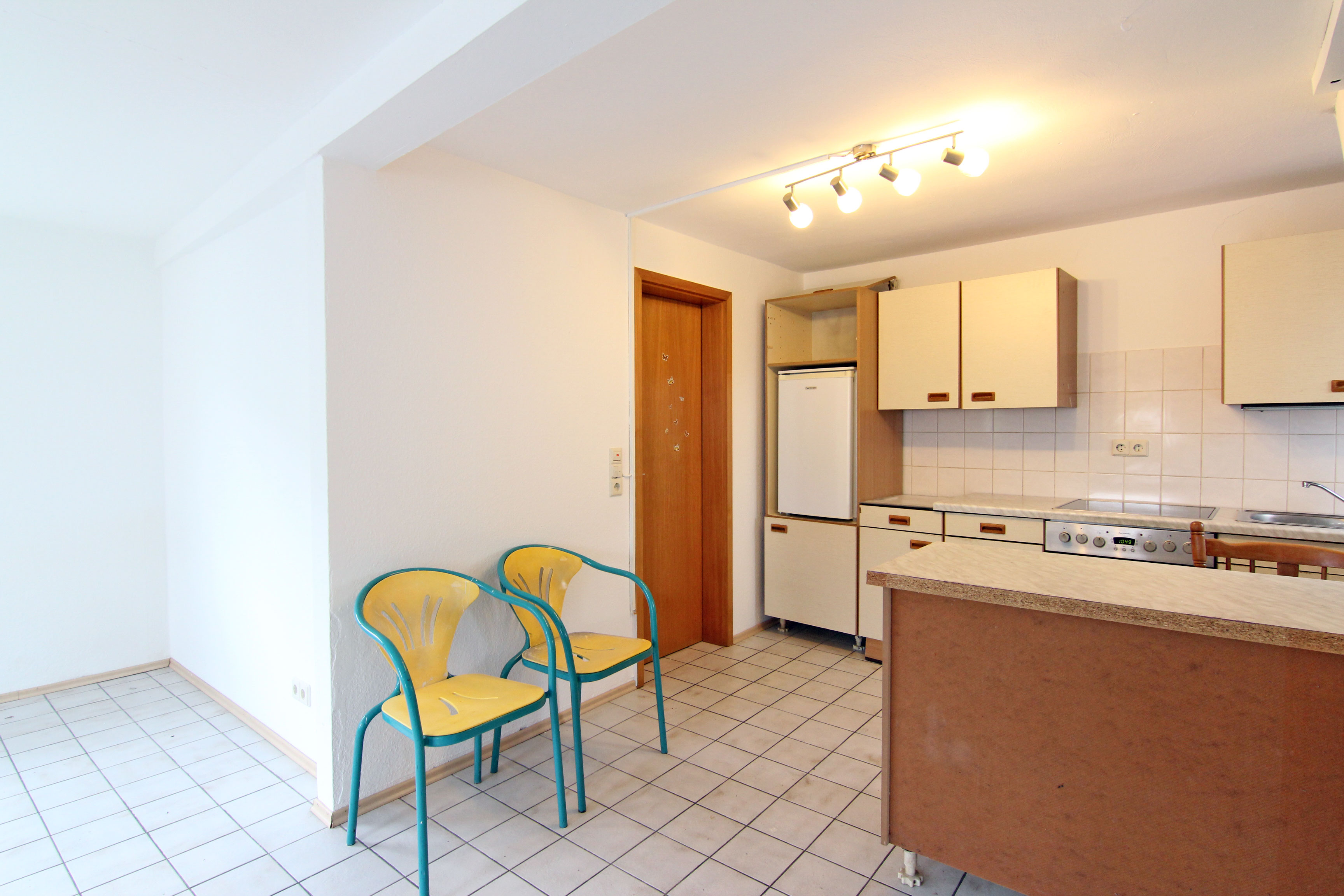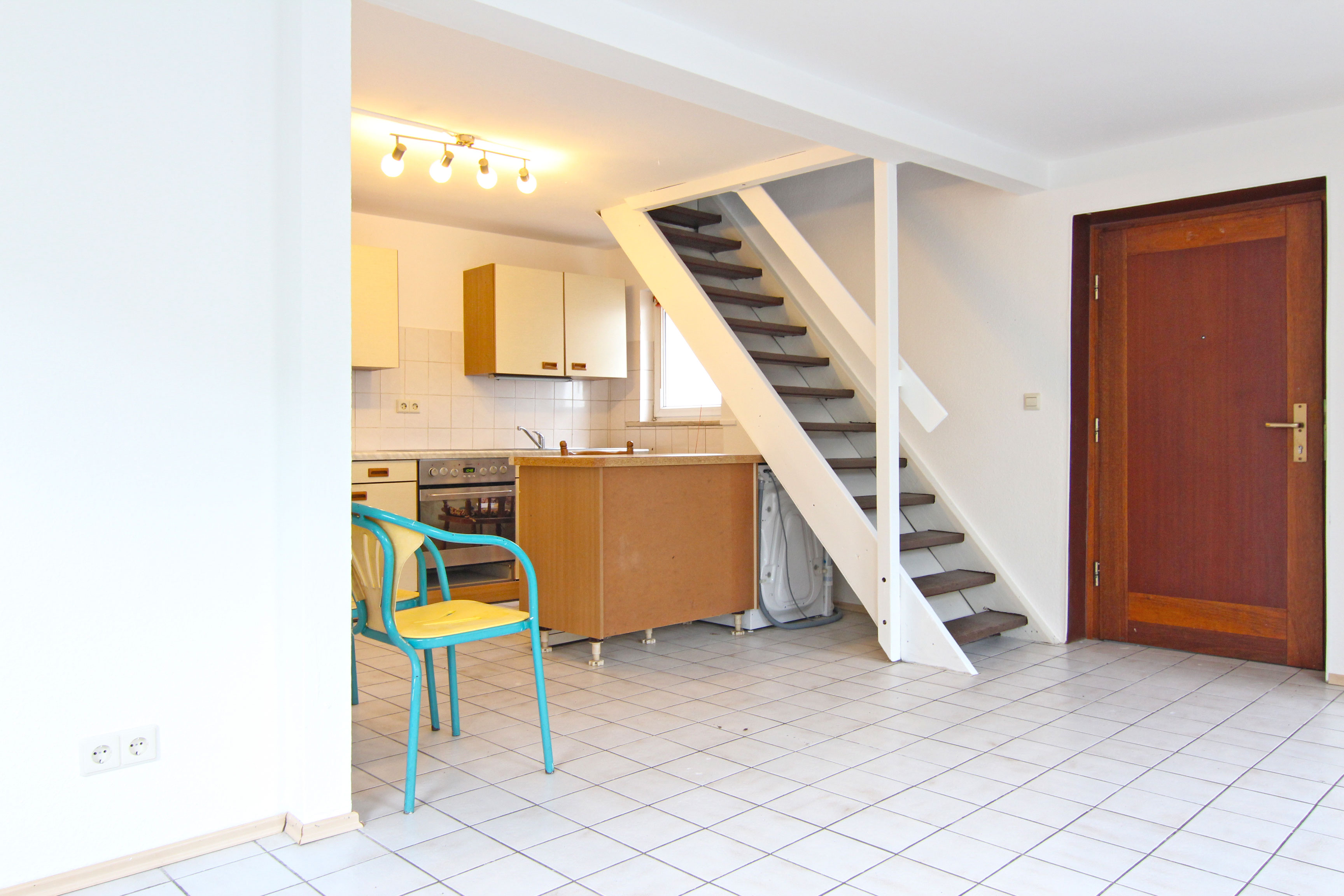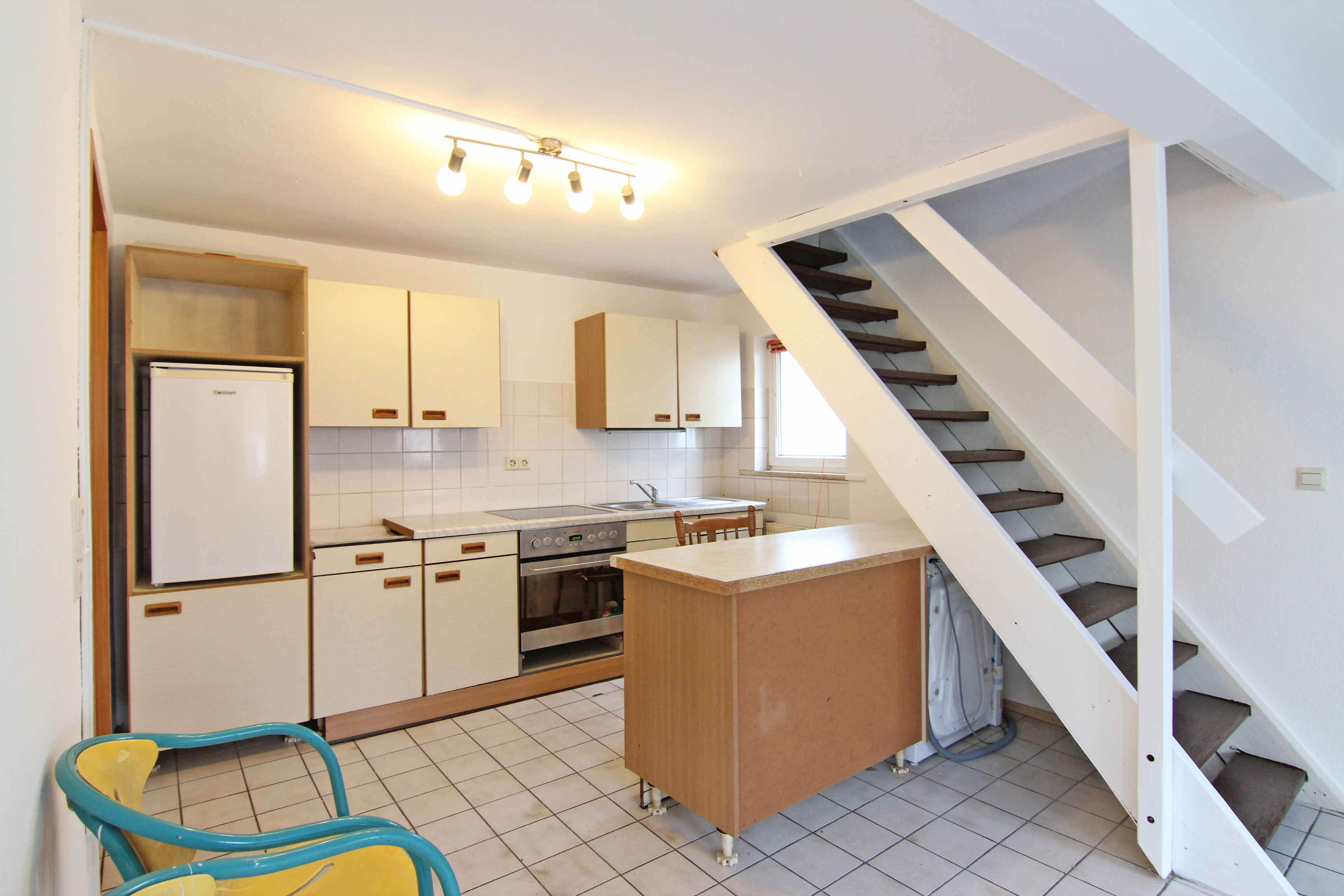 2 Zimmer über zwei Etagen, einfache Einbauküche, Tageslichtbad mit Wanne, Schlafzimmer im OG.