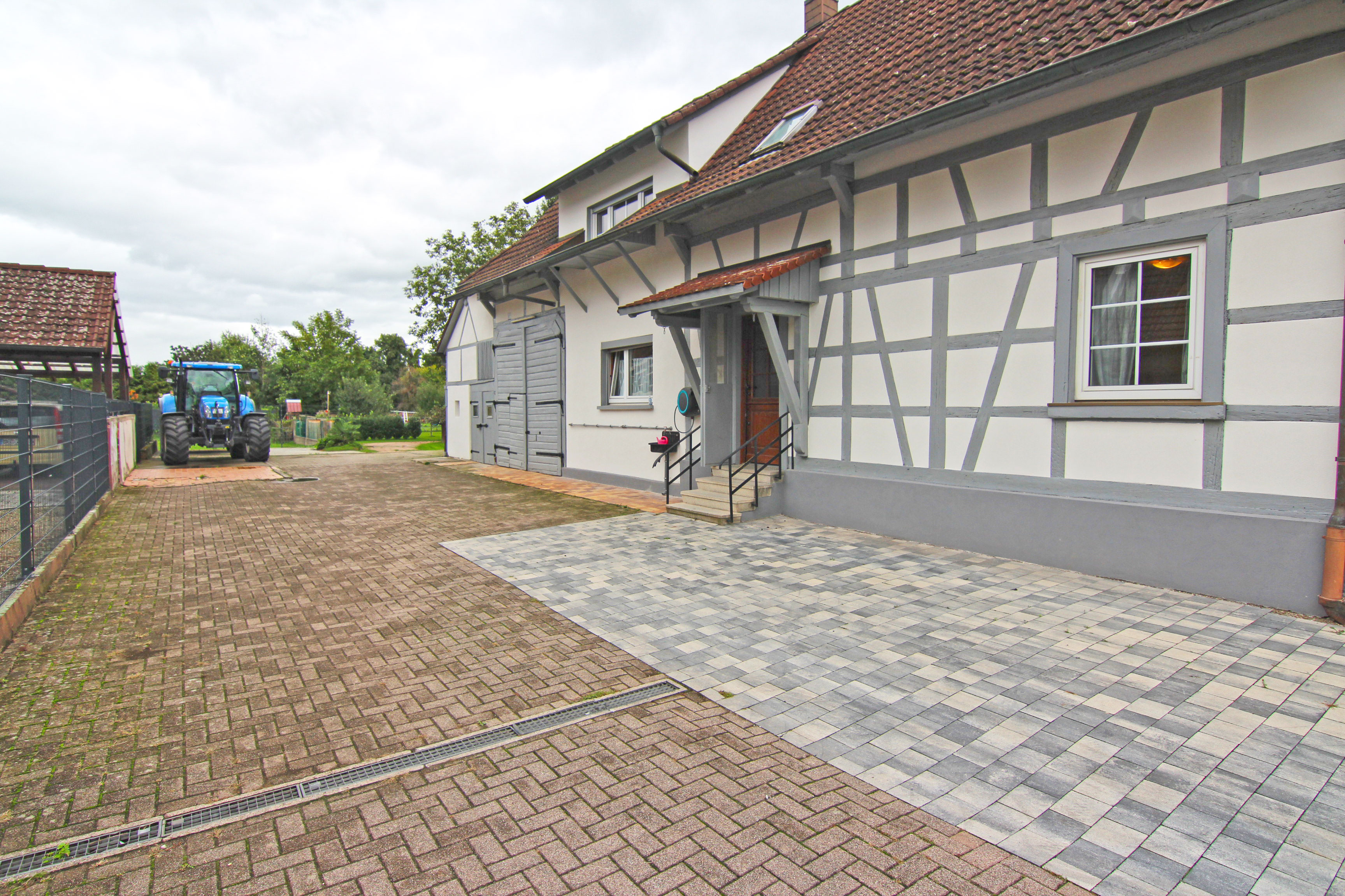 Eine angrenzende Scheune wurde zur Werkstatt umgebaut und ergänzt die Wohnräume ideal. Die große Hoffläche ist gepflastert und bietet Platz für etwa sechs Stellplätze sowie einen Carport. Zudem liegt bereits eine Baugenehmigung für ein weiteres Carport mit einer Größe von 8 x 15 Metern vor.